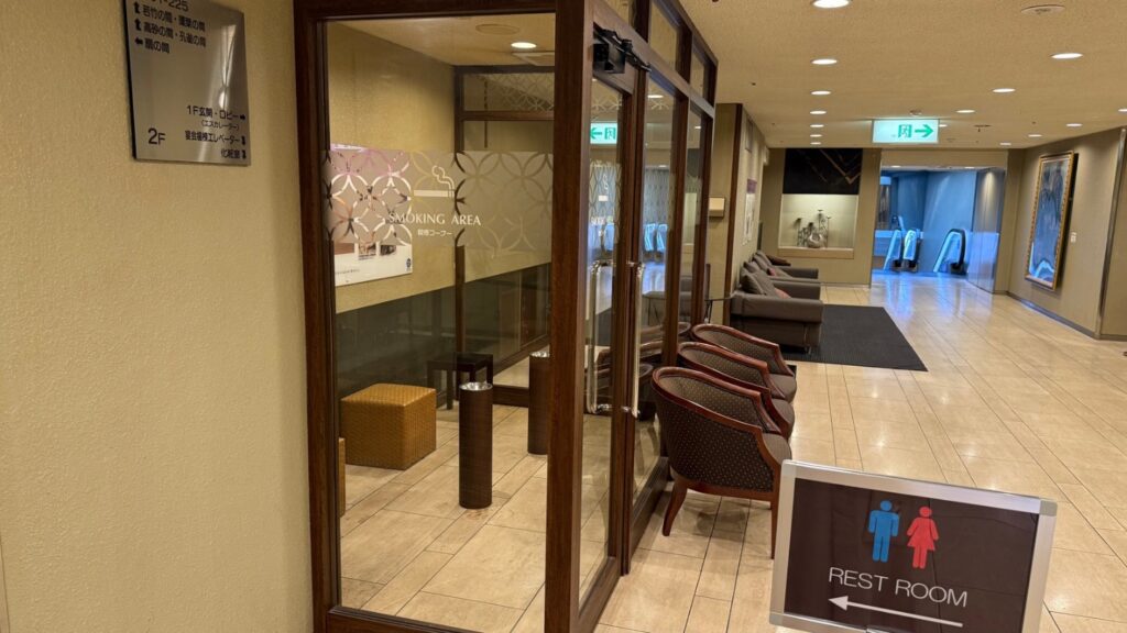 長良川温泉十八楼ホテルの喫煙所は、2階の食事会場付近にあります。朝食時はもちろん、大浴場も同フロアに備えているため癒しの時間を過ごしつつ、タバコを吸えますよ!