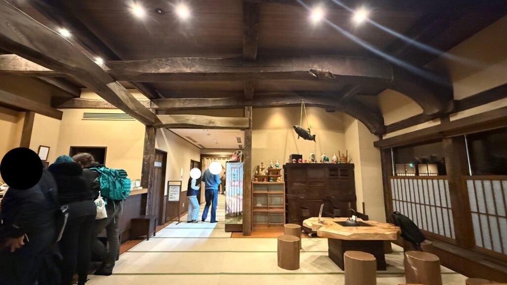 合掌造りのロビーは、重厚感のある木の柱に圧倒されます。棚の上にたくさんの「さるぼぼ」(飛騨の伝統のお守り)が飾られているのでぜひ探してみてください!
