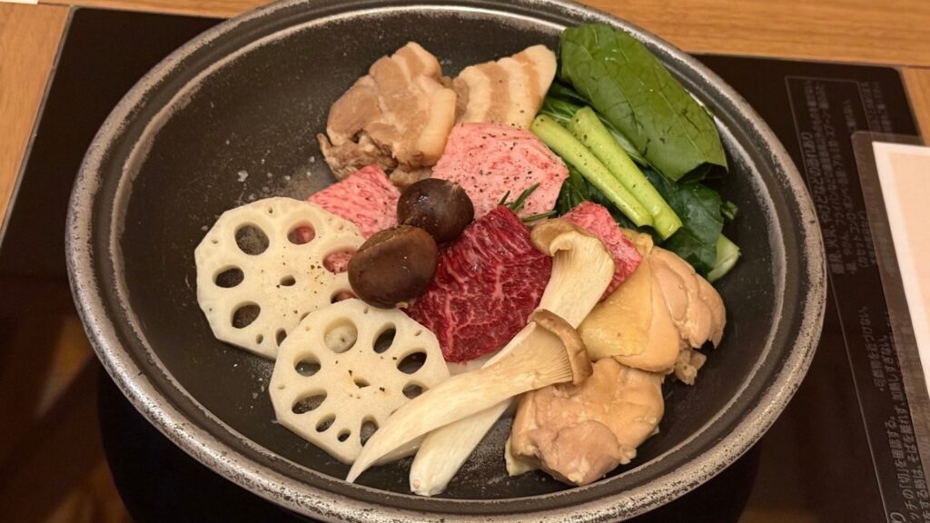 鍋を温めて自席で作る飛騨牛ステーキは、出来立てならではの旨味溢れる美味しさ!そば味噌や山椒酢につけて、肉と野菜を食べられます。
