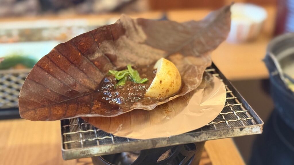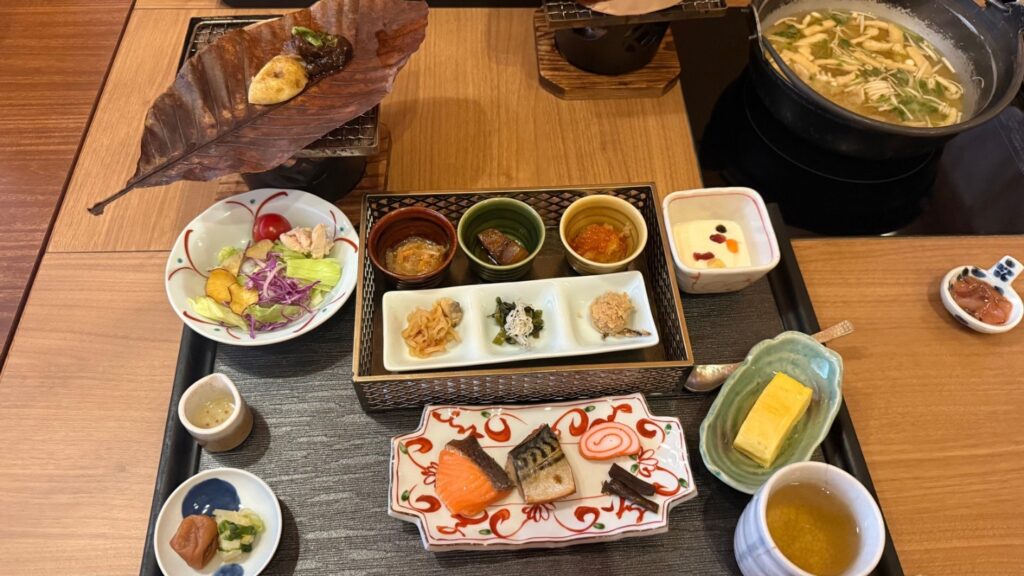 朝食は、飛騨の郷土料理である朴葉味噌をメインとした和食。お店によって、味噌の味が異なるので御宿 結の庄ならではの味はぜひ食べて欲しい!