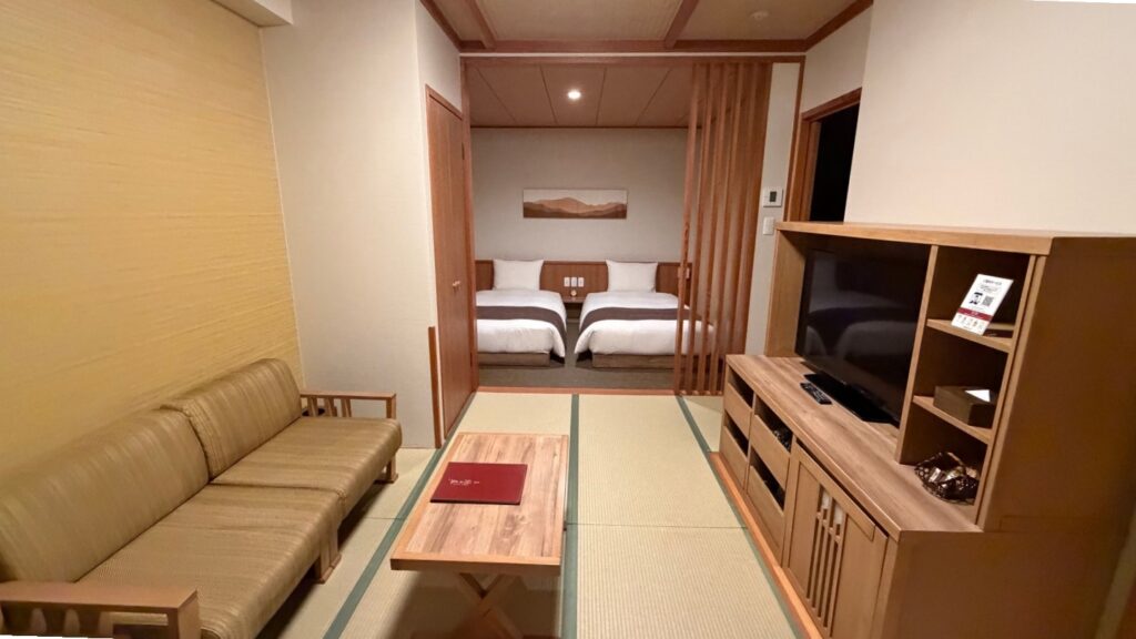 筆者は、デラックスツインに宿泊しました。2つのベッドがコンパクトにおさまっており、寛ぎスペースが確保されている造り。畳敷きの空間で足をのばしてのんびりできました!