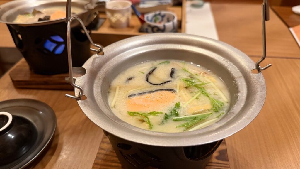 白川郷の郷土料理である「すったて汁」は、この宿オリジナルで醤油やどぶろくをブレンドしているそう。優しくまろやかな旨味ある汁は、おかわりしたくなるほど!