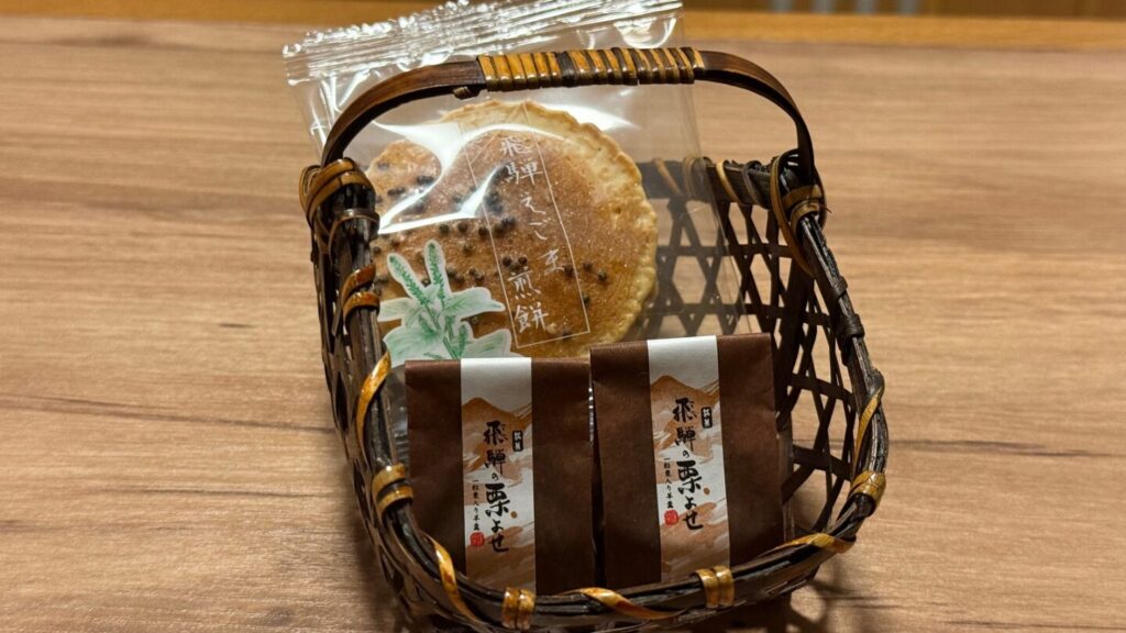 全体的に木のぬくもりを感じるしつらえで、ほっと一息つける客室。飛騨のお菓子が机に置いてあり、地元の食材を使った味わいを堪能し、1階の土産処で実際に購入できる点が嬉しかったです!