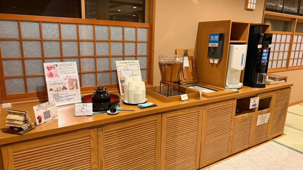 湯上り処では、無料のコーヒー、紅茶、甘酒。ソフトドリンクが飲み放題。夜はアイス、朝は乳酸菌飲料を一本選べます。