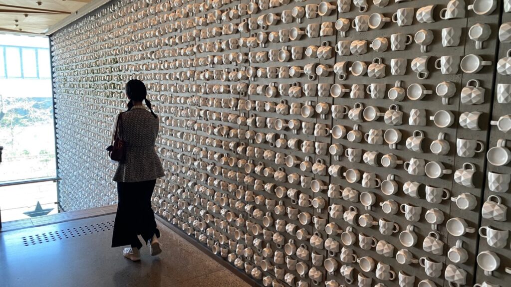 折り紙をモチーフとした天井のデザインや、タイル職人が手掛けた壁にあるティーカップウォール、大きなガラス窓から見える桜並木(春限定です!)を眺められます。